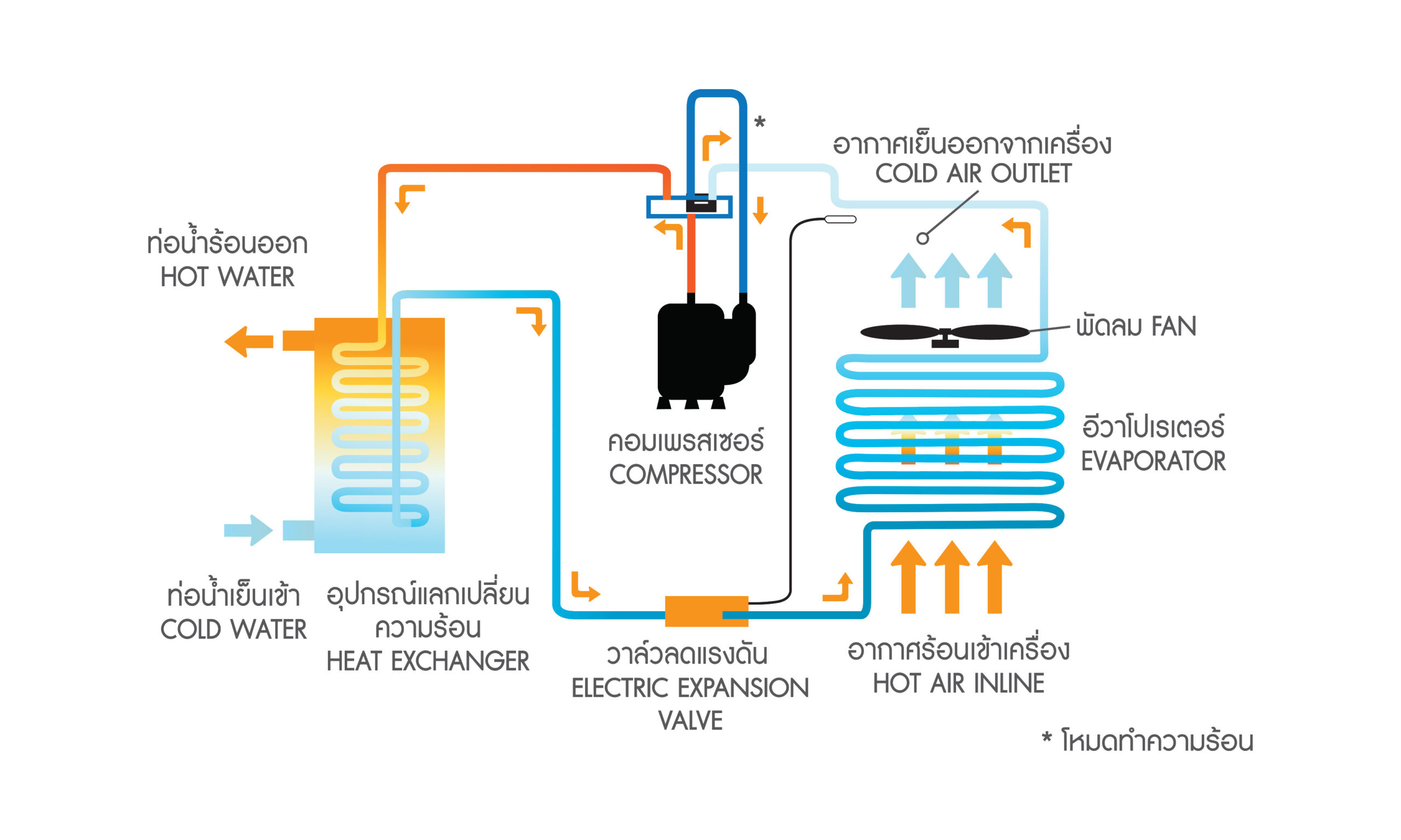 Heat Pump หรือ “ปั๊มความร้อน” คือระบบที่ดึงพลังงานความร้อนจากอากาศมาผลิตเป็น “น้ำร้อน” โดยไม่ต้องใช้ขดลวดไฟฟ้าให้ความร้อนเหมือนเครื่องทำน้ำร้อนไฟฟ้า แต่ใช้หลักการเดียวกับเครื่องปรับอากาศ เพียงกลับทิศทางพลังงานจาก “การทำความเย็น” เป็น “การผลิตความร้อน”